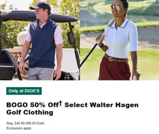 Don't miss out! Shop in store and enjoy BOGO 50% off select Walter Hagen golf clothing.